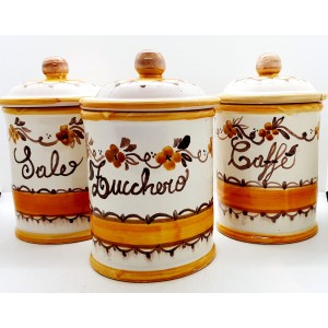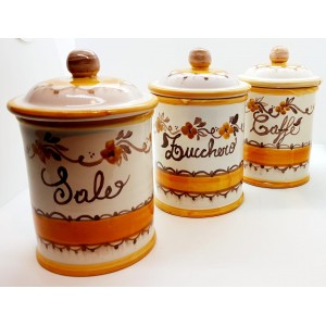 Set 3 Barattoli per Sale, Zucchero e Caffè sono realizzati e dipinti a mano da "Le Ceramiche del Castello di Nina Palomba" con materie prime di esclusiva origine italiana. L'articolo include certificato di autenticità dipinto a mano. Made in Italy.