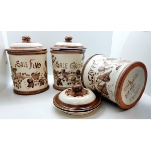 Set 3 Barattoli per Sale Fino, Sale Doppio e Caffè sono realizzati e dipinti a mano da "Le Ceramiche del Castello di Nina Palomba" con materie prime di esclusiva origine italiana. L'articolo include certificato di autenticità dipinto a mano. Made in Italy.