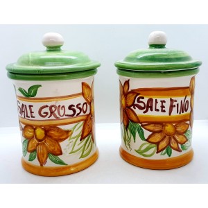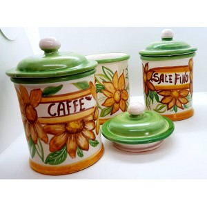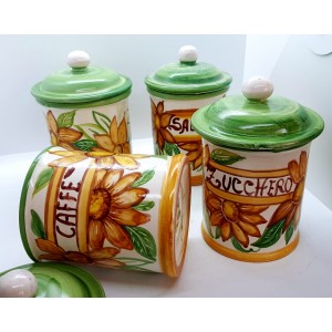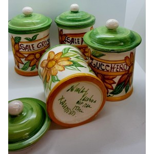 Set 4 Barattoli per Sale Fino, Sale Grosso, Zucchero e Caffè sono realizzati e dipinti a mano da "Le Ceramiche del Castello di Nina Palomba" con materie prime di esclusiva origine italiana. L'articolo include certificato di autenticità dipinto a mano. Made in Italy.