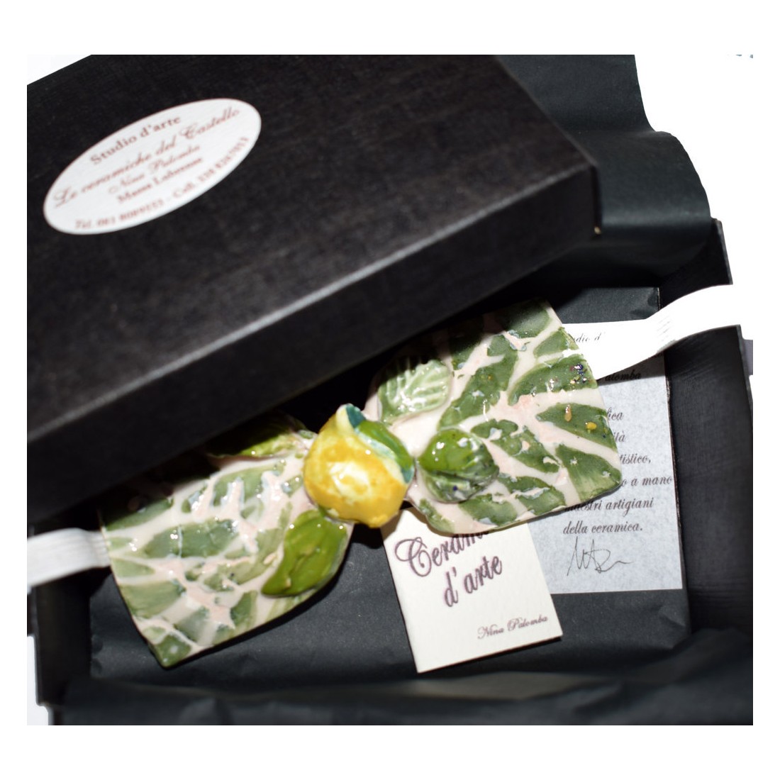 Papillon in Ceramica - Linea Classica è realizzato e dipinto a mano da "Le Ceramiche del Castello di Nina Palomba" con materie prime di esclusiva origine italiana. L'articolo include certificato di autenticità dipinto a mano. Made in Italy. Tutte le imperfezioni, le screpolature di smalto, i puntini, le colature sono testimonianza di un prodotto realizzato interamente a mano. Sono gocce di oro che impreziosiscono il pezzo.
