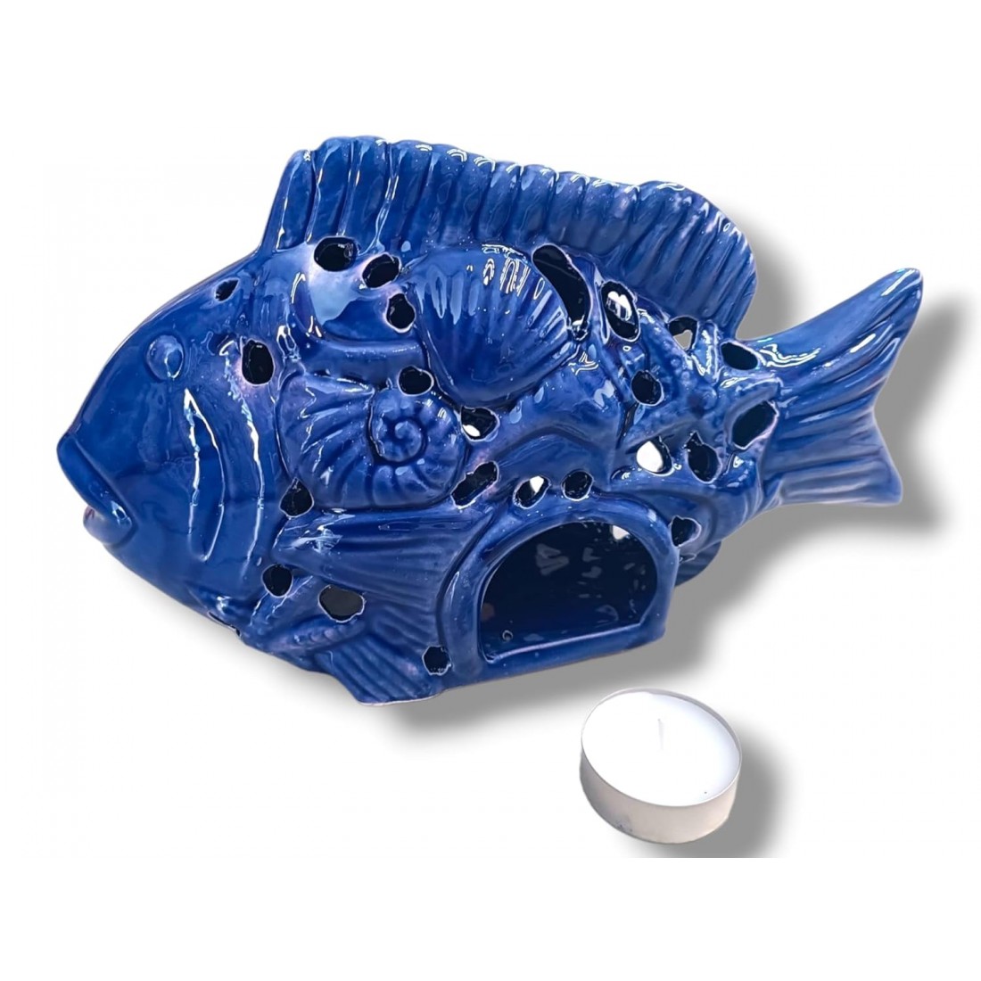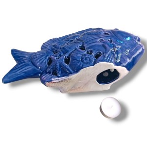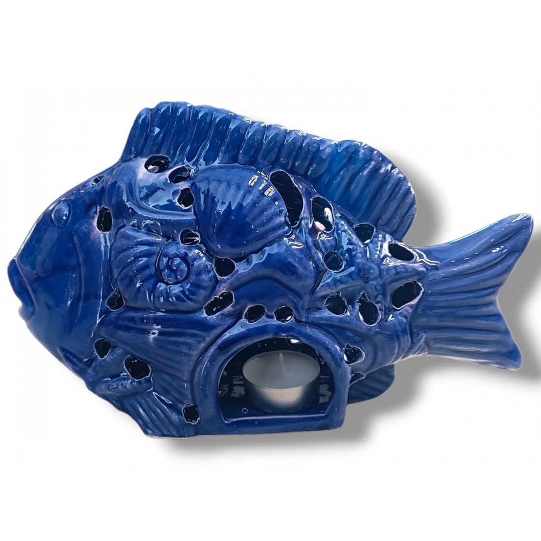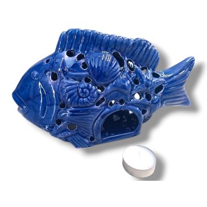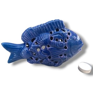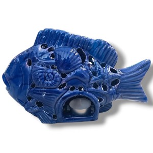 Pesce Portacandela è realizzata e dipinta a mano da "Le Ceramiche del Castello di Nina Palomba" con materie prime di esclusiva origine italiana. Decorazione da interno/esterno.