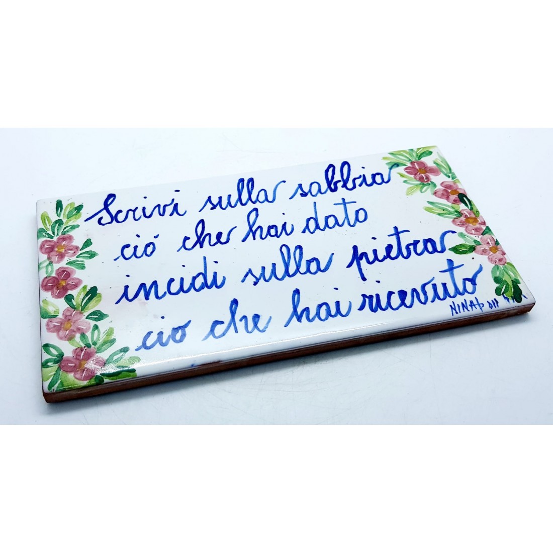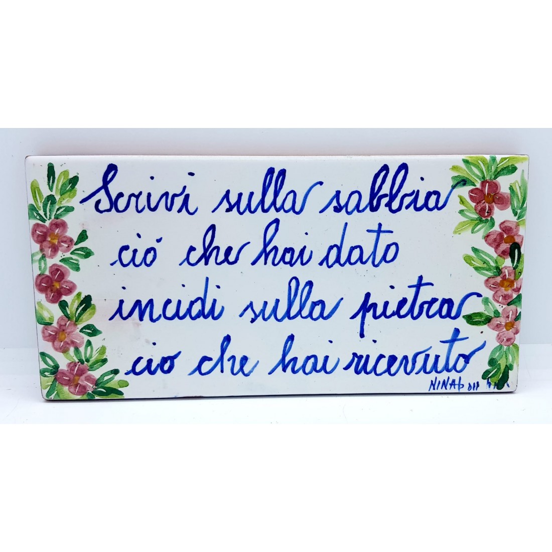 ARTE, CULTURA, PROFESSIONALITà interagiscono assieme per confluire al raggiungimento di opere che conservano nel tempo il fascino creativo dell' artista. Le targhe che qui vi proponiamo sono realizzate e dipinte a mano da "Le Ceramiche del Castello di Nina Palomba" con materie prime di esclusiva origine italiana.