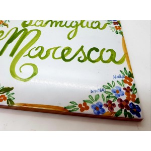 ARTE, CULTURA, PROFESSIONALITà interagiscono assieme per confluire al raggiungimento di opere che conservano nel tempo il fascino creativo dell' artista. Le targhe che qui vi proponiamo sono realizzate e dipinte a mano da "Le Ceramiche del Castello di Nina Palomba" con materie prime di esclusiva origine italiana.